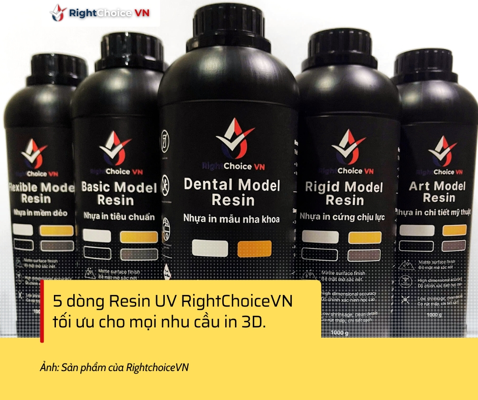 Xuất phát từ bối cảnh đó, RightchoiceVN được thành lập với định hướng nghiên cứu, phát triển và sản xuất resin UV “Made in Vietnam” dành cho các dòng máy in 3D công nghệ SLA, LCD và DLP, nhằm từng bước làm chủ công nghệ vật liệu trong nước.