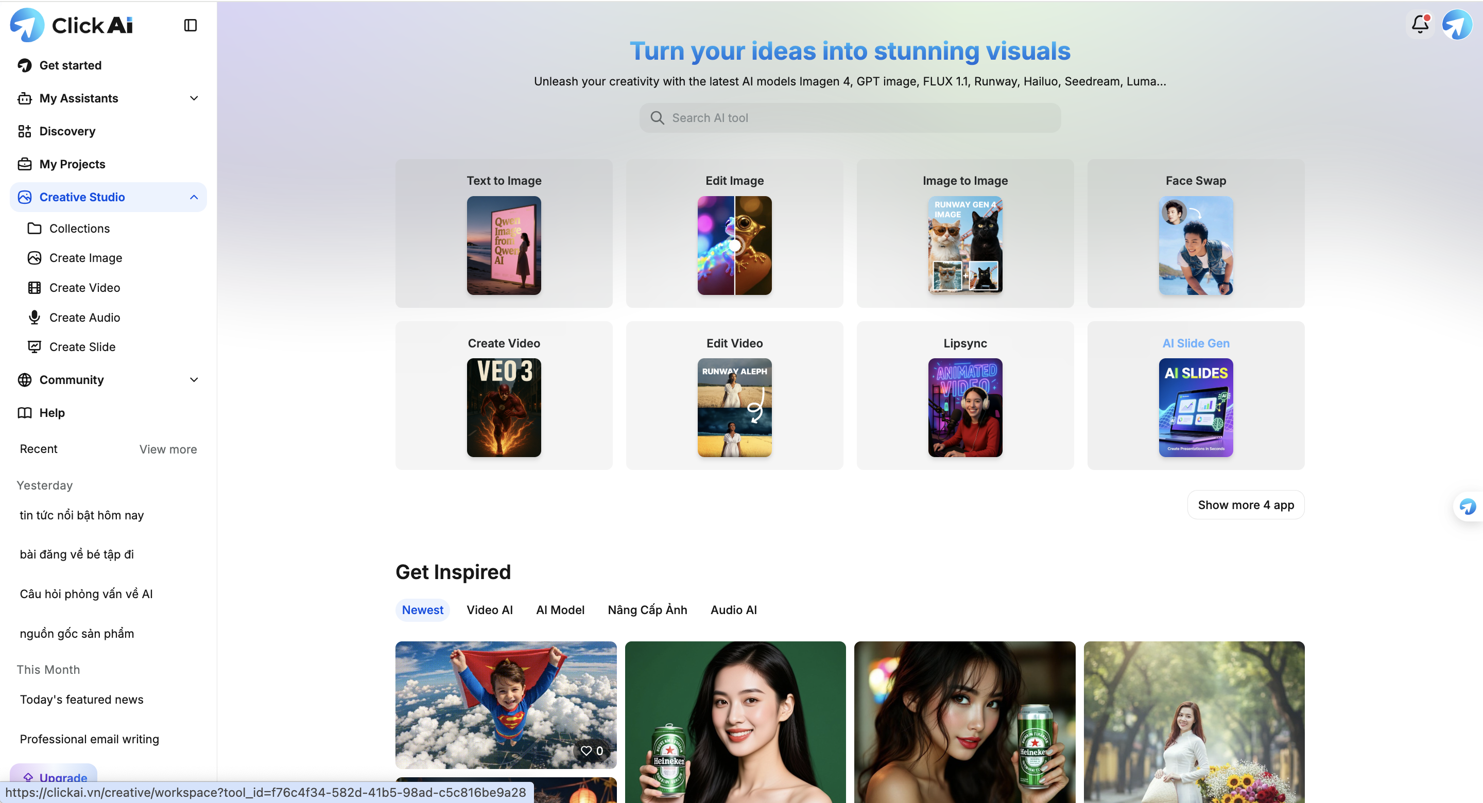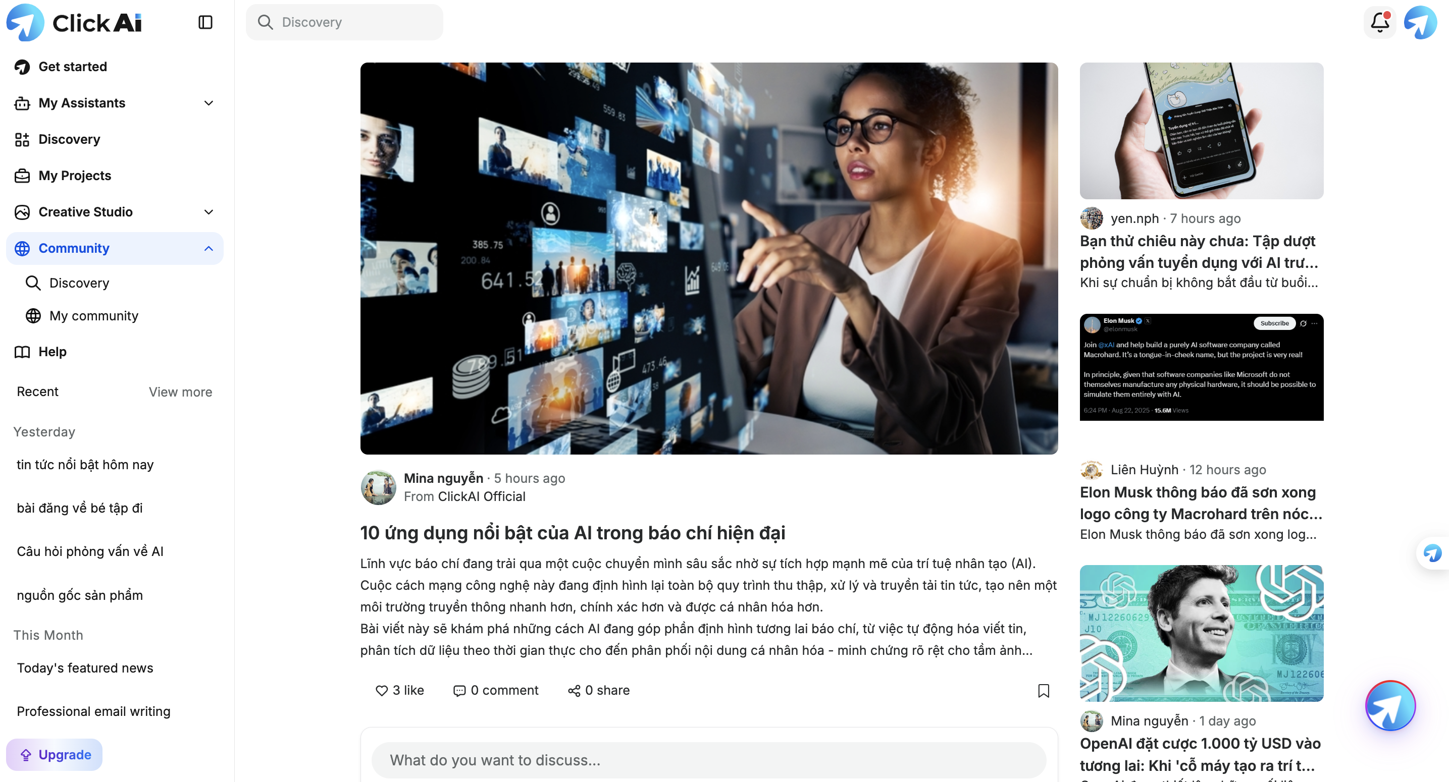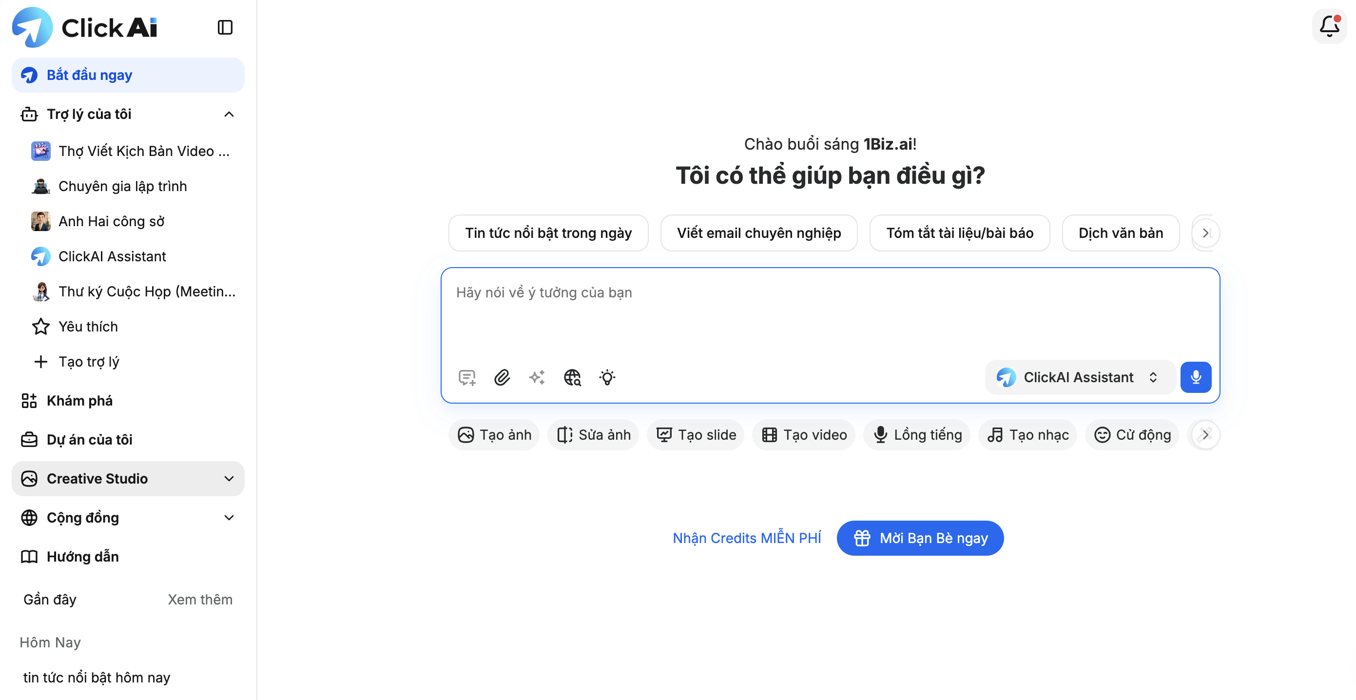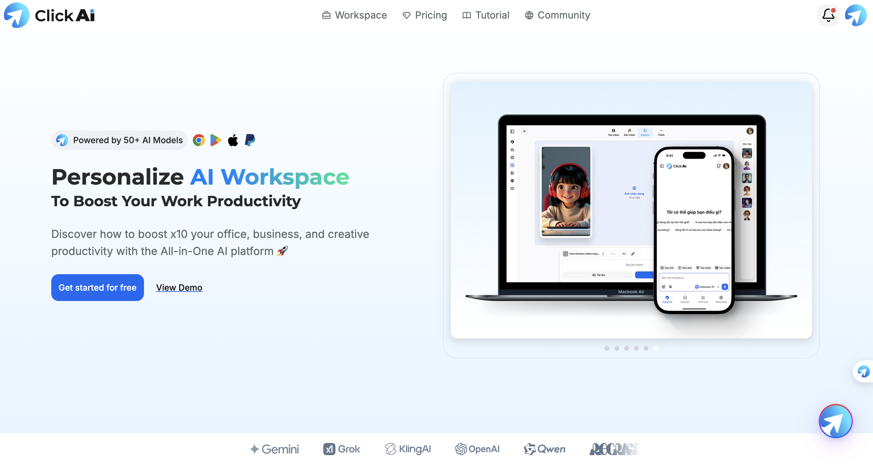 Click AI Workspace là nền tảng AI tất cả trong một. Nơi bạn có thể khám phá cách tăng hiệu suất trong công việc văn phòng, kinh doanh và sáng tạo cùng tất cả những mô hình AI mới nhất, tất cả chỉ trong một Workspace
