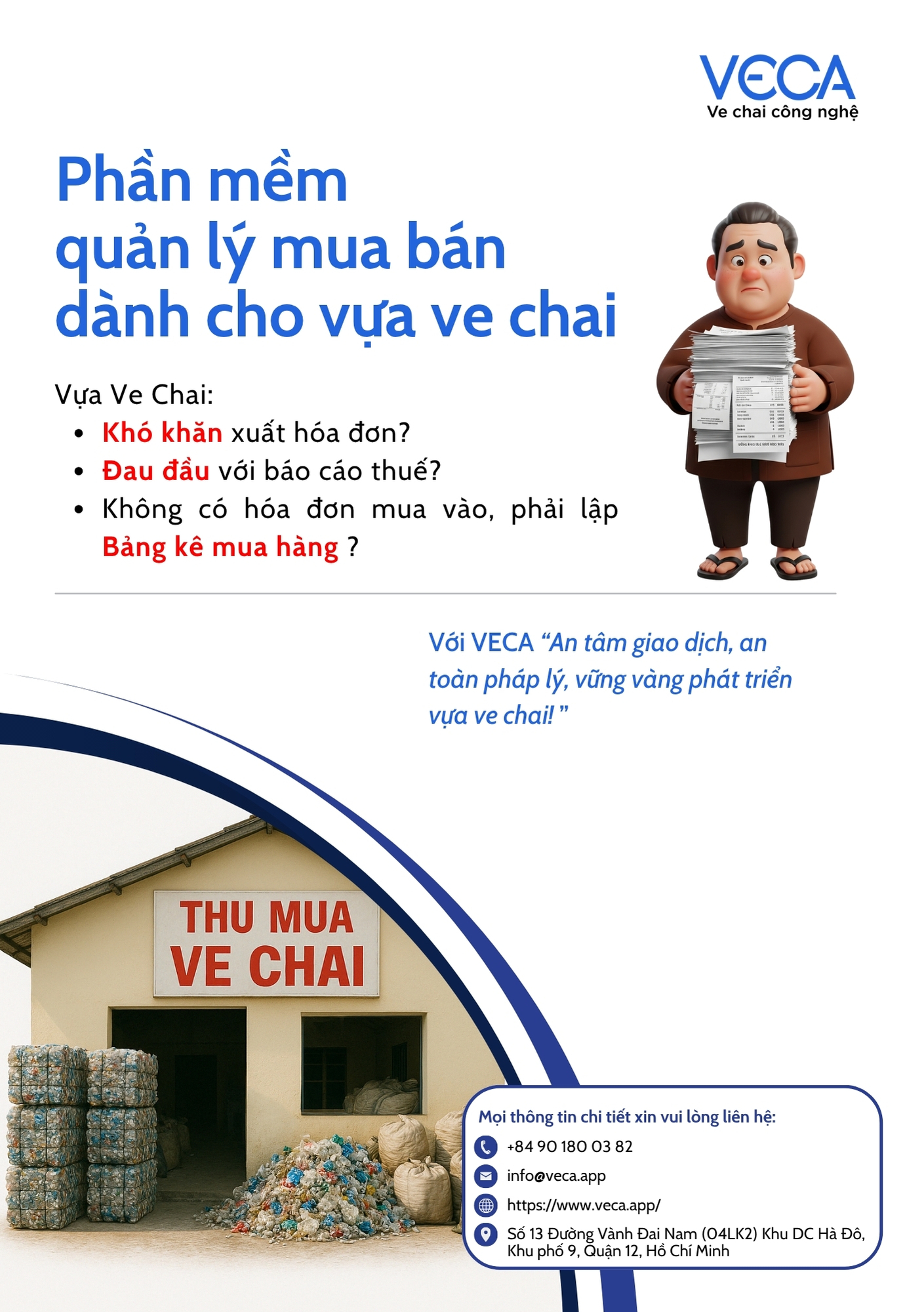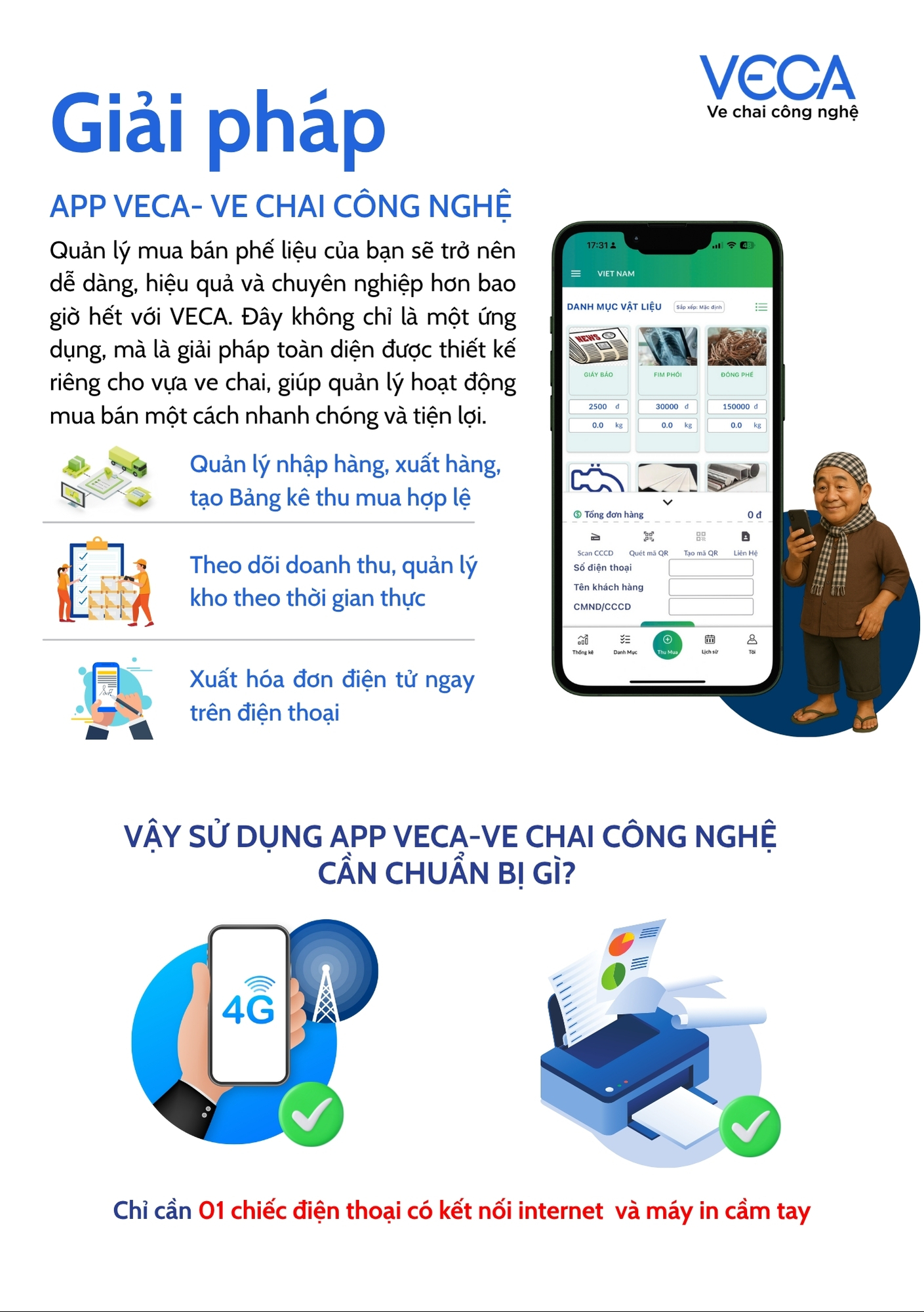 VECA - giải pháp quản lý mua bán dành cho vựa phế liệu, kiên định xây dựng một hệ sinh thái tái chế bền vững và là đòn bẩy thúc đẩy kinh tế tuần hoàn. Song song đó, chúng tôi quyết tâm hướng đến chuyển đổi số và nâng cao sinh kế của người lao động trong chuỗi cung ứng nguyên vật liệu tái chế.
