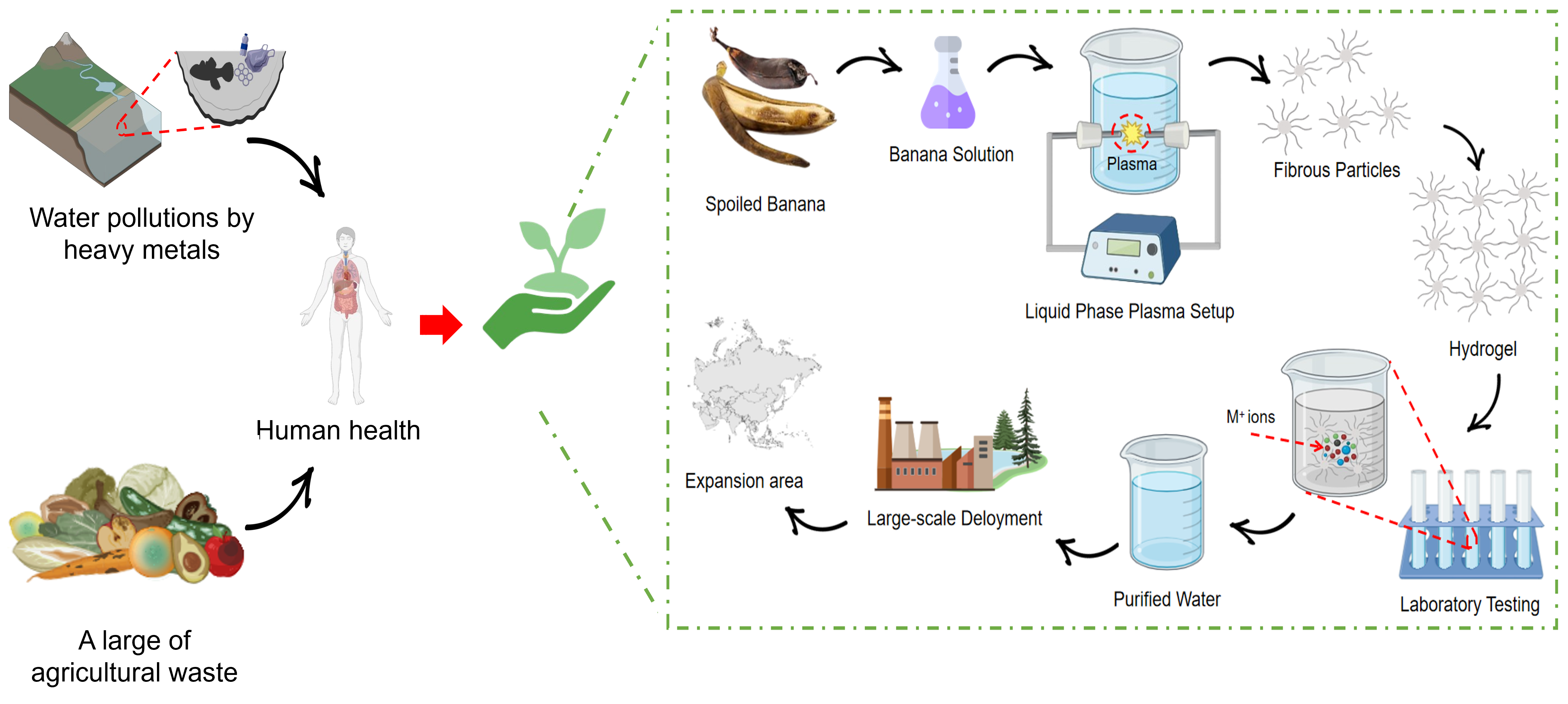 Hiện nay, vấn đề xử lý rác thải nông nghiệp và ô nhiễm nguồn nước đang trở thành hai thách thức lớn tại Việt Nam. Mỗi năm, hàng nghìn tấn chuối bị hư hỏng trong quá trình thu hoạch, vận chuyển và tiêu thụ bị thải bỏ, gây lãng phí và phát sinh khí nhà kính. Trong khi đó, nhu cầu về các vật liệu xử lý nước thân thiện môi trường, giá thành thấp và hiệu quả cao ngày càng tăng. Từ thực tế đó, dự án “Chuyển đổi chuối hư hỏng thành vật liệu hydrogel chức năng bằng phương pháp plasma dung dịch (Solution Plasma)” được hình thành. Công nghệ plasma dung dịch là một kỹ thuật tiên tiến, không sử dụng hóa chất độc hại nhằm tạo ra sản phẩm hydrogel có khả năng xử lý nước. Sản phẩm không chỉ mang tính xanh, sạch, bền vững, mà còn mở ra hướng tận dụng phụ phẩm nông nghiệp để tạo ra vật liệu có giá trị cao, góp phần phát triển kinh tế tuần hoàn và giảm thiểu tác động môi trường. Dự án hướng đến khả năng thương mại hóa trong lĩnh vực xử lý nước sinh hoạt và nước thải công nghiệp, đồng thời thể hiện tinh thần đổi mới sáng tạo vì cộng đồng và môi trường Việt Nam.