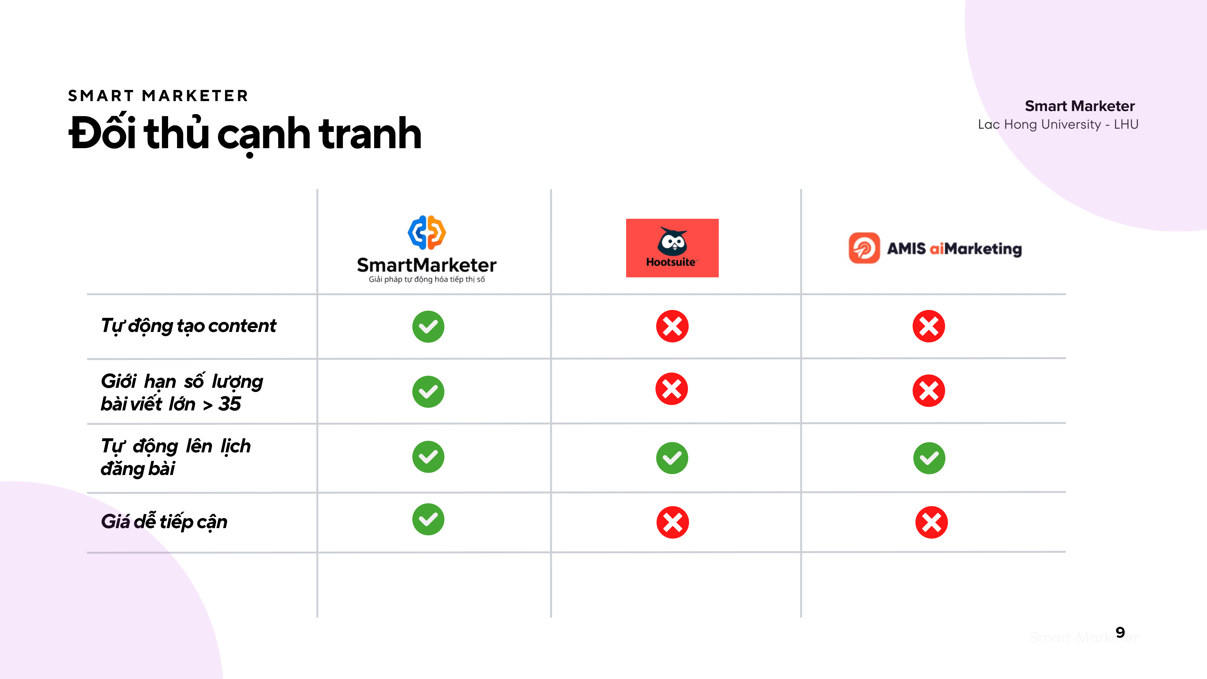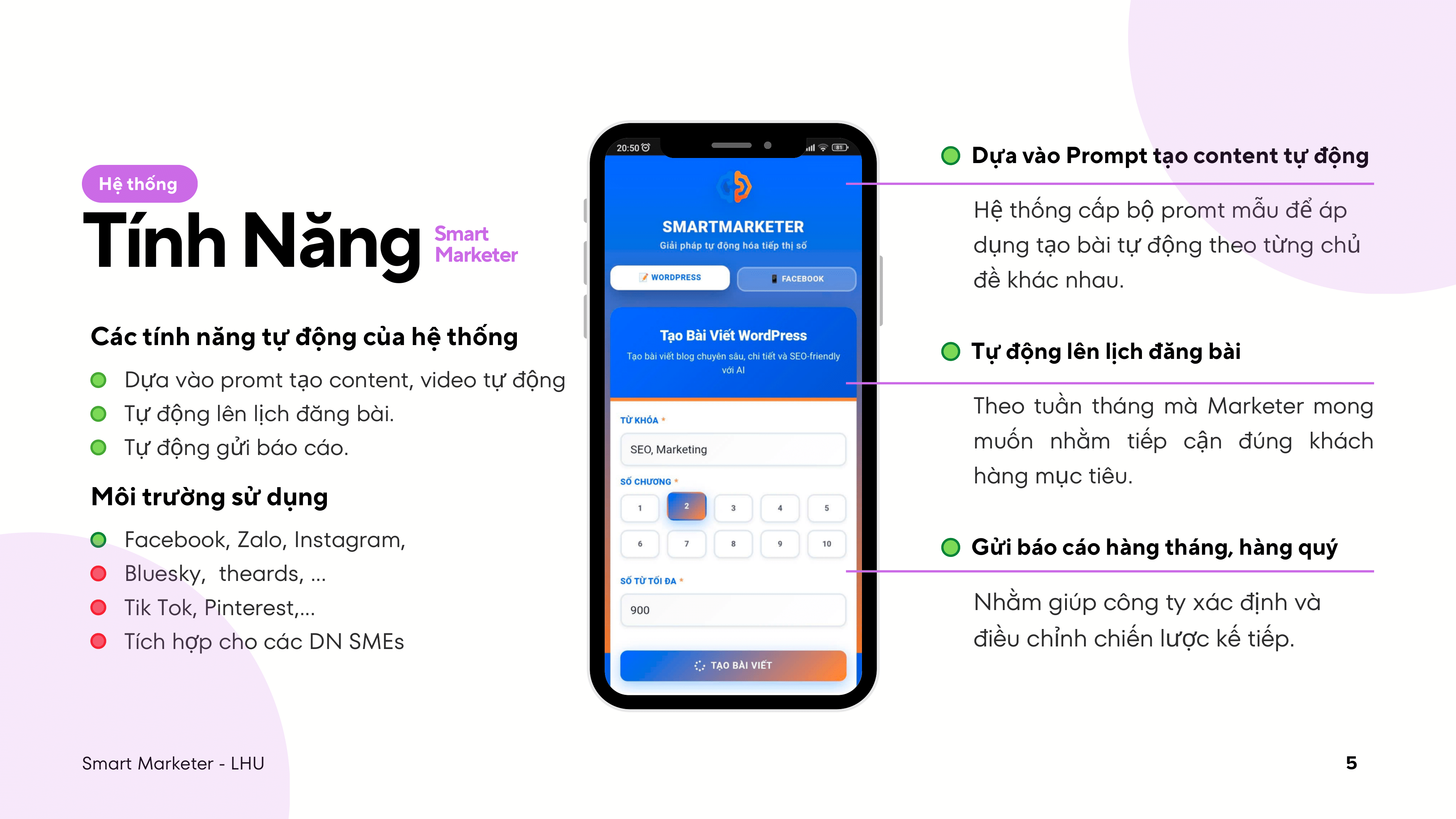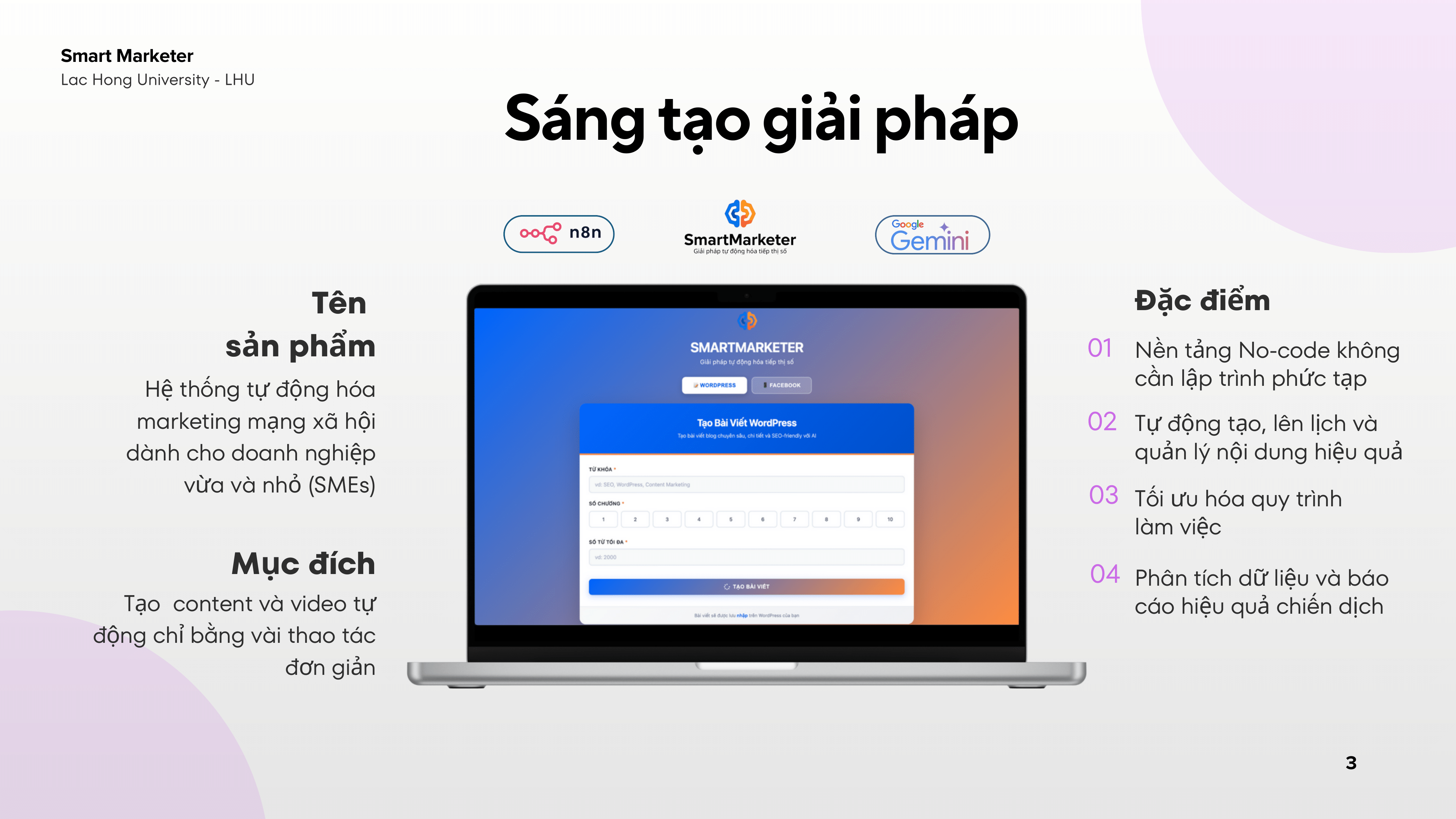 SmartMarketer là nền tảng ứng dụng trí tuệ nhân tạo giúp tự động hóa hoạt động tiếp thị số cho doanh nghiệp. Hệ thống có thể phân tích dữ liệu khách hàng, tối ưu chiến dịch quảng cáo và gợi ý nội dung phù hợp, giúp doanh nghiệp tiết kiệm thời gian, chi phí và nâng cao hiệu quả tiếp cận thị trường.