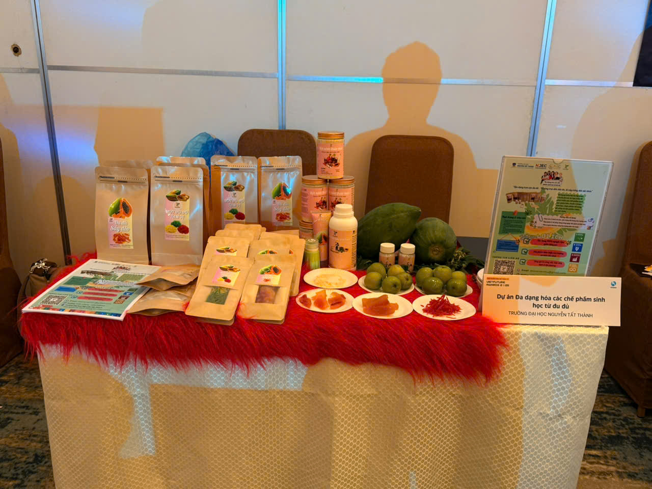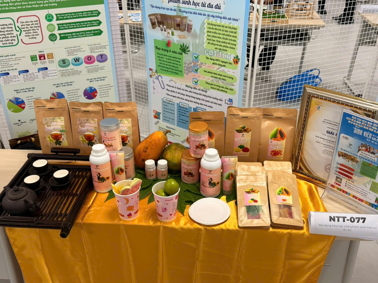 Điểm khác biệt nổi bật của dự án là tự chủ nguồn giống đu đủ chất lượng cao, được tuyển chọn và lai tạo để đảm bảo độ ngọt trên 80%, hương thơm tự nhiên và giá trị dinh dưỡng vượt trội. Từ đó, nhóm đã phát triển chuỗi sản phẩm sinh học hoàn chỉnh theo định hướng kinh tế tuần hoàn xanh, bao gồm: đu đủ sấy dẻo và mứt đu đủ giàu vitamin; thuốc trừ sâu sinh học chiết xuất từ lá và vỏ đu đủ qua công nghệ lên men vi sinh; viên enzyme tiêu hóa chứa papain tinh khiết cao giúp hỗ trợ hệ tiêu hóa; gel tẩy tế bào chết thiên nhiên sử dụng hạt đu đủ thay thế hạt vi nhựa; bột nêm thảo mộc kết hợp hạt đu đủ với các dược liệu giàu hoạt tính sinh học; bột kháng giun và trà thảo dược từ hoa và lá đu đủ đực với nhiều hương vị phù hợp từng đối tượng sử dụng.