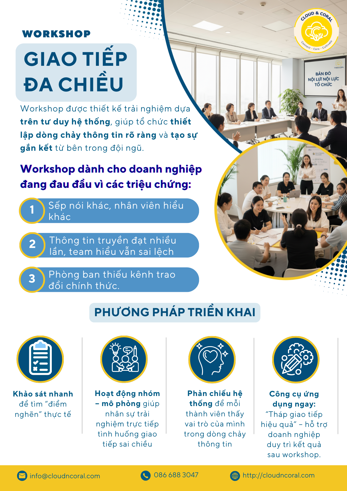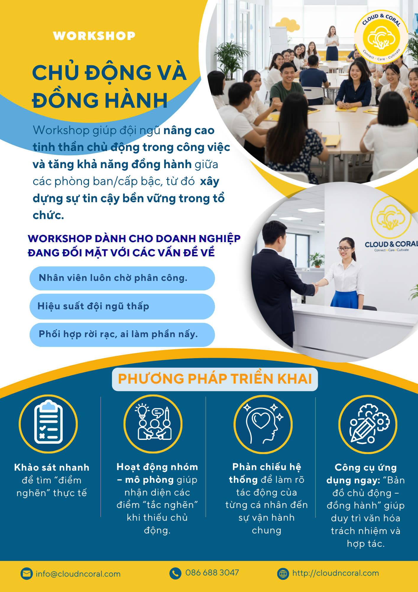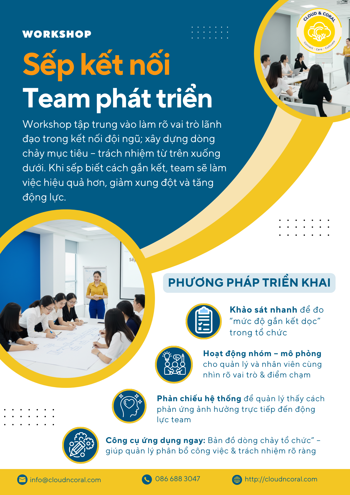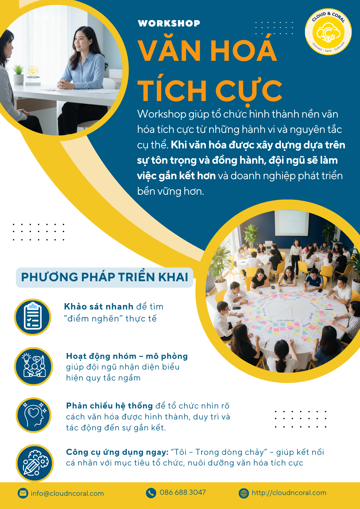 Cloud & Coral cung cấp giải pháp về gắn kết đội ngũ dựa trên ứng dụng góc nhìn từ Liệu pháp tâm ý học hệ thống. Bạn hãy thử trải nghiệm bằng chuỗi Workshop Gắn kết giúp đội ngũ kết nối từ bên trong